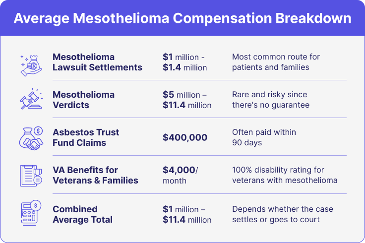 Mesothelioma patients and their families may be eligible for compensation to cover medical bills, lost income, and more. Sources of mesothelioma compensation include lawsuits and asbestos trust funds, which pay over $1 million on average. See if you qualify now.